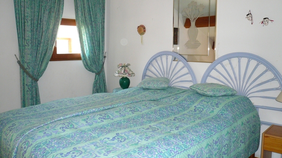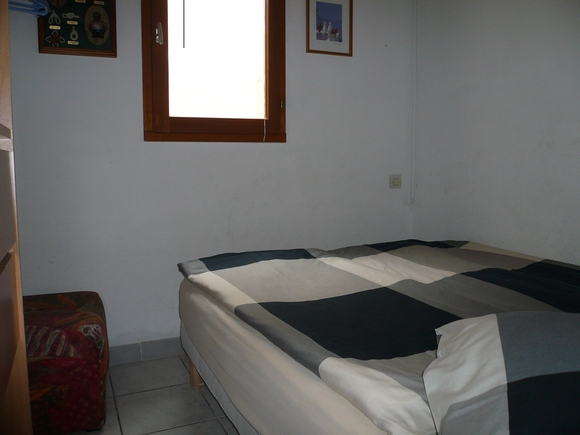 Mit Doppelbett (140 cm x 190 cm) und offenem Schrank ist dieses Schlafzimmer im Erdgeschoß ausgestattet.