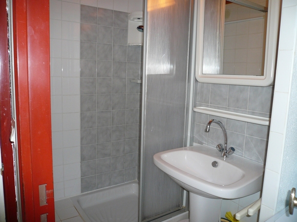 Rundum gefliest und mit einer über die gesamte Breite des Raumes reichenden Dusche zeigt sich das Badezimmer.